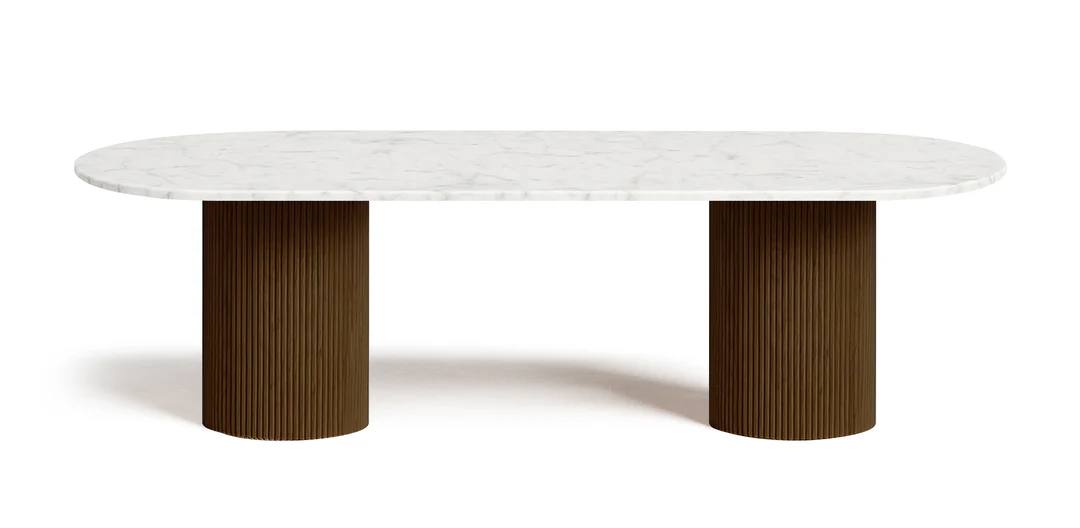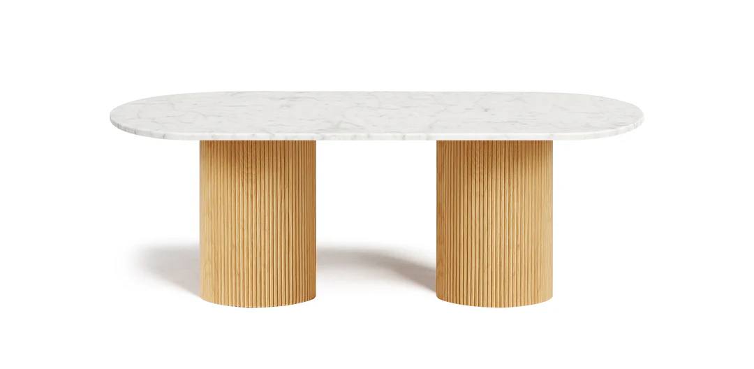 An elegant marble top oval dining table with a fluted oak wooden base that adds texture and visual interest. A refined centerpiece for modern and classic dining spaces alike.