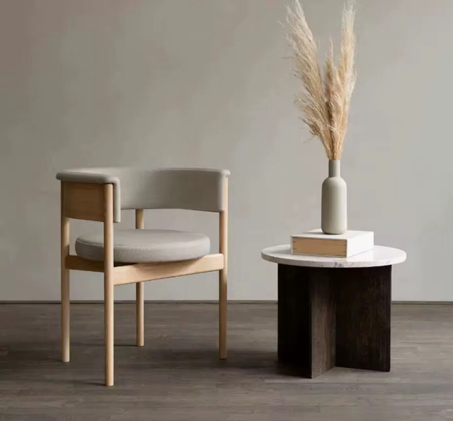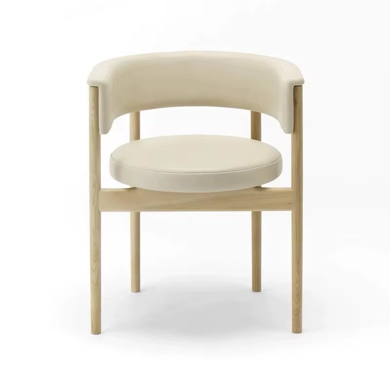 A masterpiece of modern minimalism, this chair is designed for those who appreciate bold, architectural forms. It features over-sized cylindrical legs crafted from solid wood, providing a grounded and stable foundation. The seat and backrest are upholstered in premium White Bouclé fabric, offering a high-contrast tactile experience that is both cozy and chic. The “floating” backrest design adds a light, airy feel to its solid structure, making it a perfect statement piece for any contemporary interior.